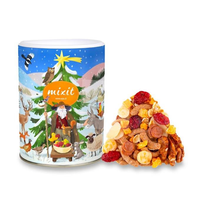 vlašské orechy 10 %, kľukva 10 % (kľukva "brusnica kanadská" 65 %, cukor, slnečnicový olej), kukuričné lupienky v mliečnej čokoláde 9 % (mliečna čokoláda 56 % (cukor, kakaové maslo, sušené plnotučné