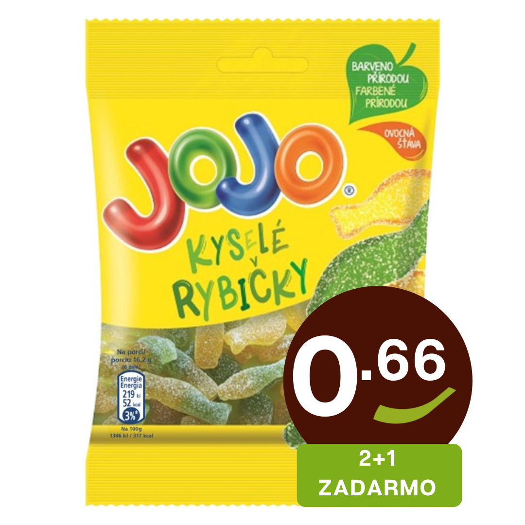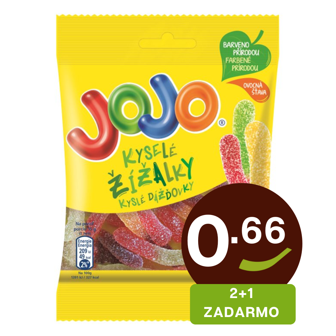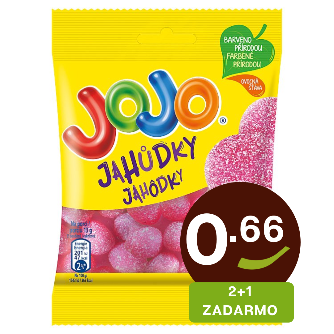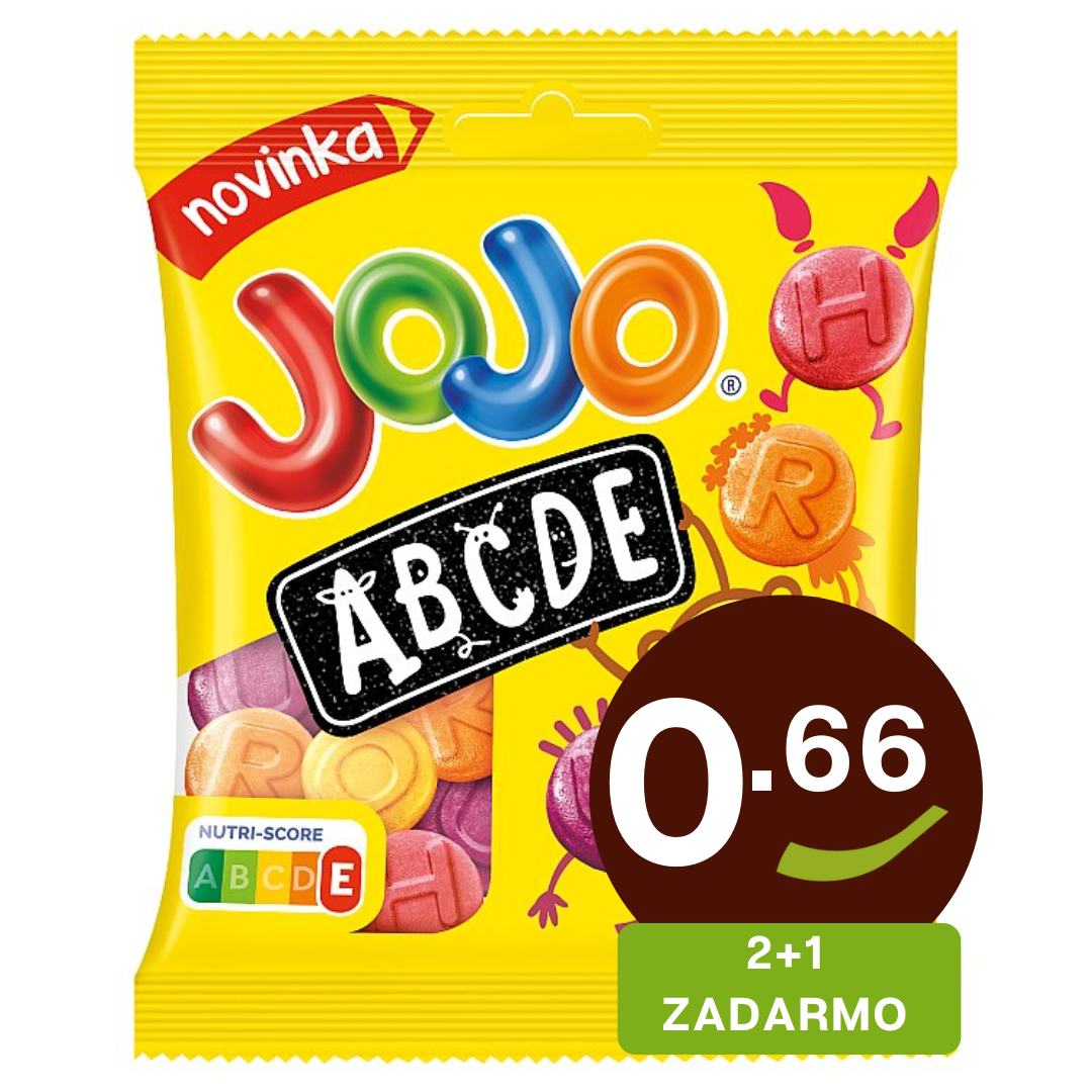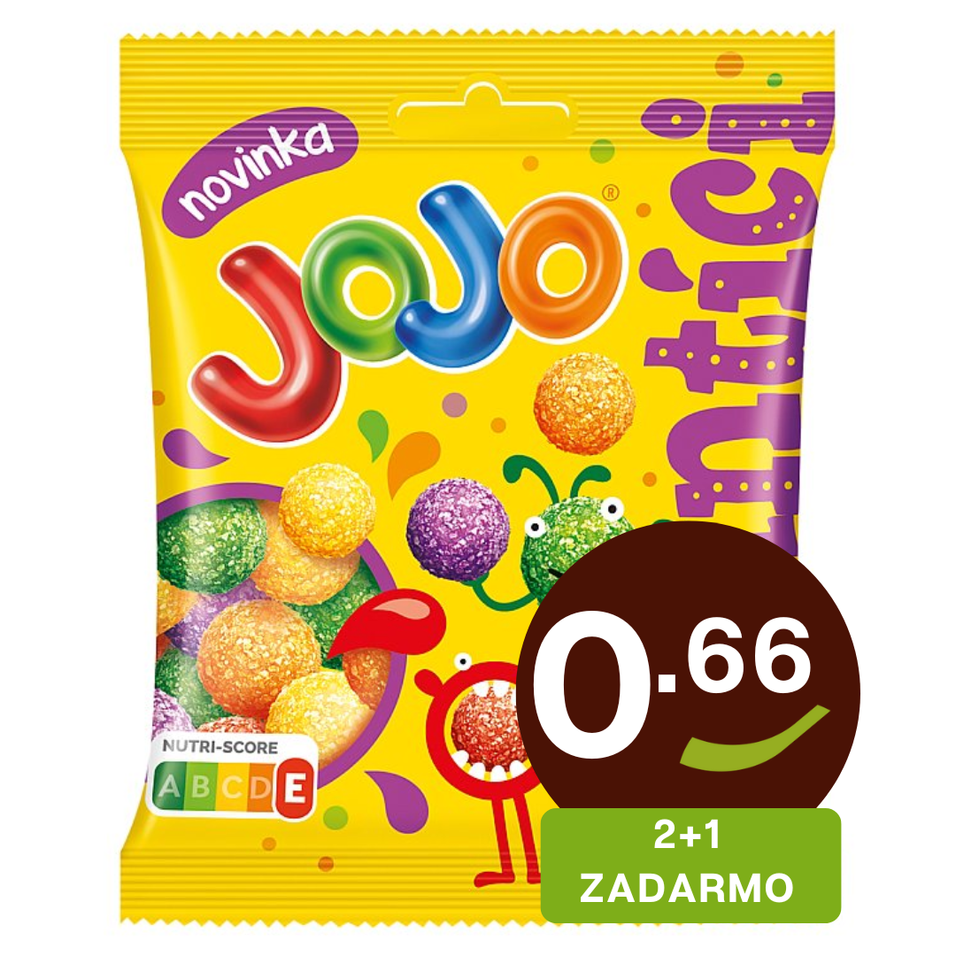 Cukor, glukózový sirup, pitná voda, želatína, kyselina (kyselina citrónová), arómy (jablko, višňa, pomaranč, citrón), palmový olej 0,1 %**, povlaková látka (karnaubský vosk), rastlinné koncentráty a extrakty (mrkva, požlt farbiarsky, ibištek), invertný cukrový sirup, farbivo (extrakt z papriky), ** Palmový olej je použitý z certifikovaných zdrojov. Viac informácií na: www.jojo.cz,