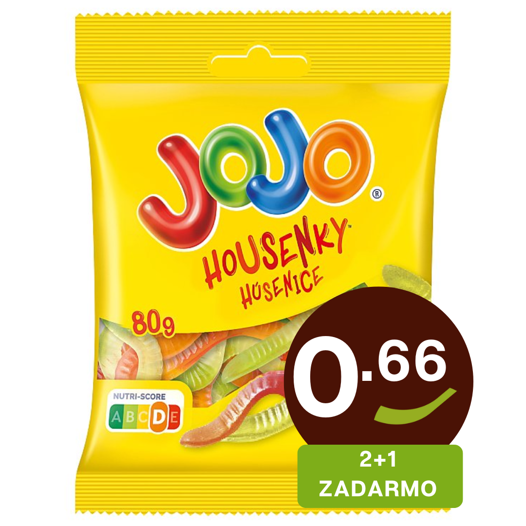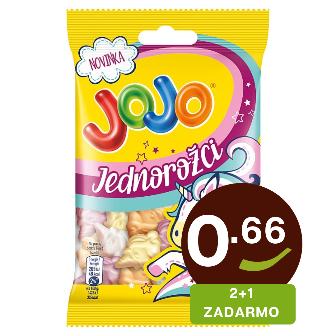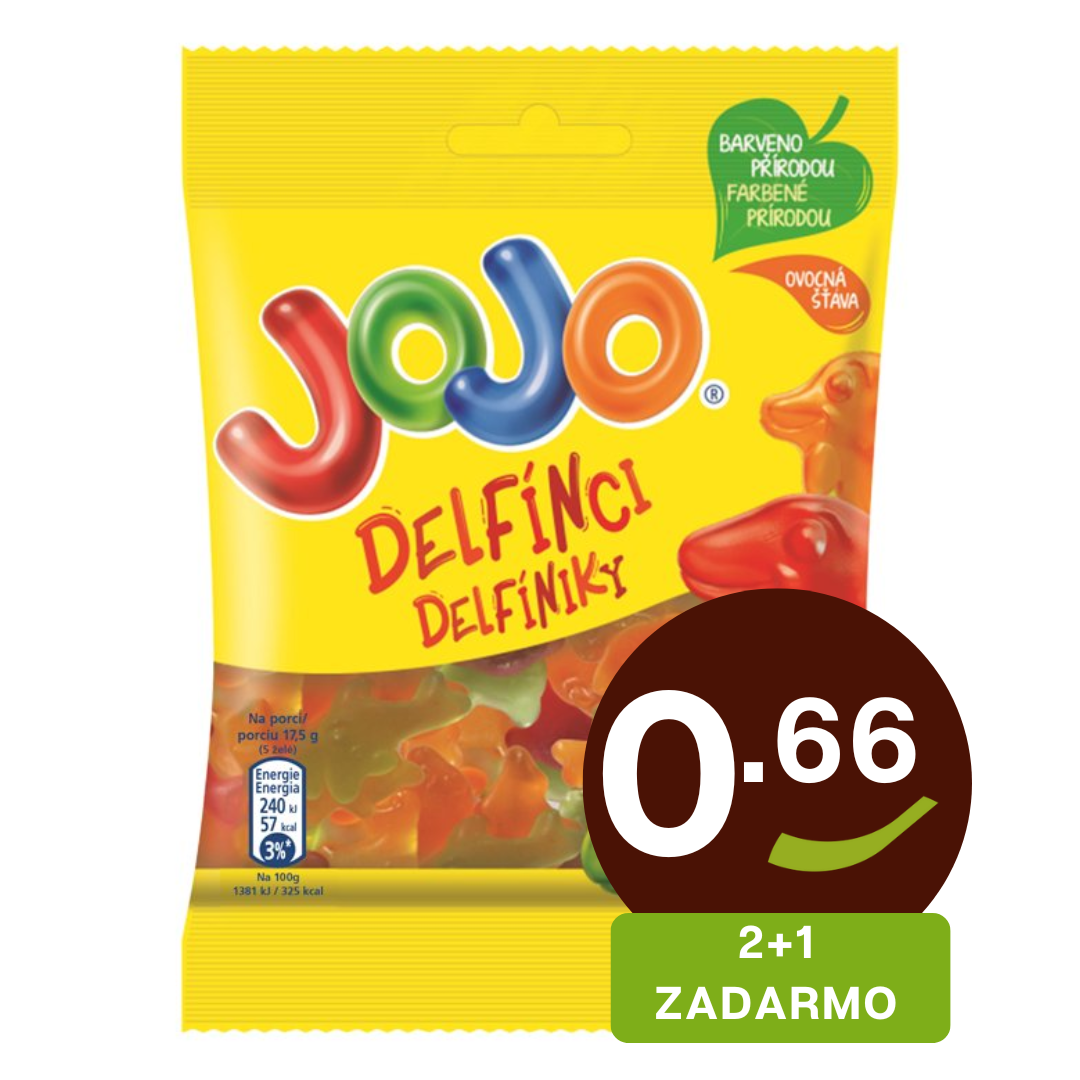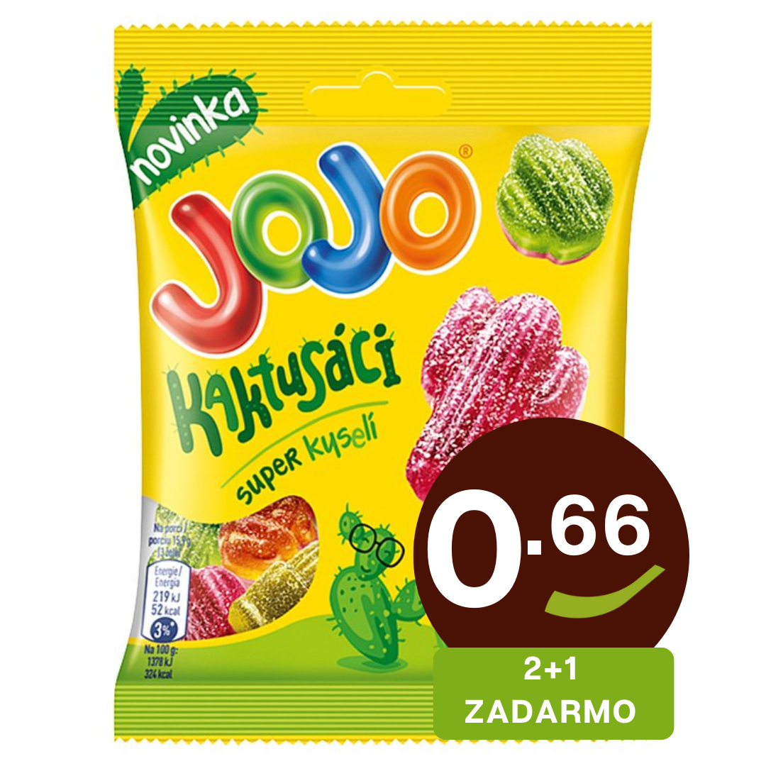Cukor, glukózový sirup, pitná voda, želatína, kyselina (kyselina citrónová), arómy (jablko, višňa, pomaranč, citrón), palmový olej 0,1 %**, povlaková látka (karnaubský vosk), rastlinné koncentráty a extrakty (mrkva, požlt farbiarsky, ibištek), invertný cukrový sirup, farbivo (extrakt z papriky), ** Palmový olej je použitý z certifikovaných zdrojov. Viac informácií na: www.jojo.cz,