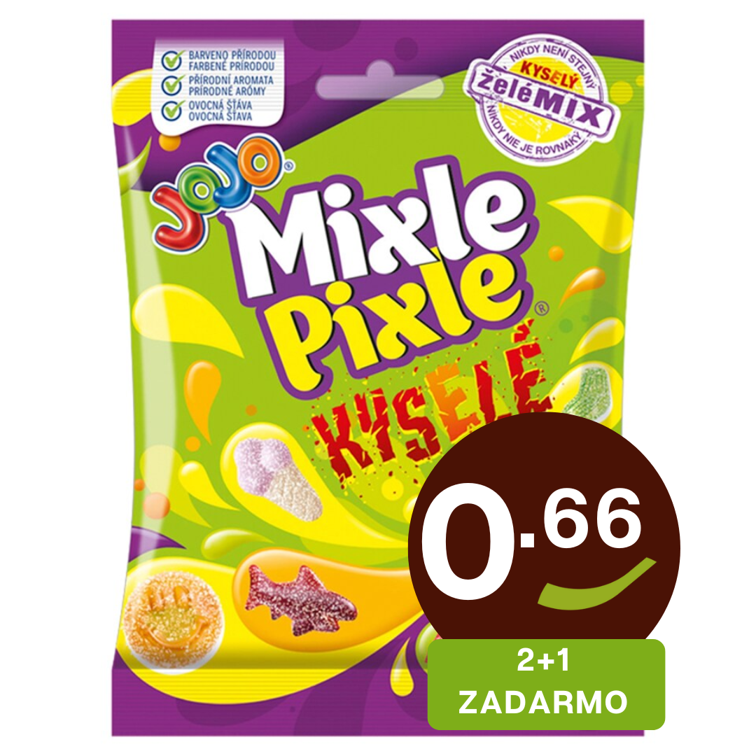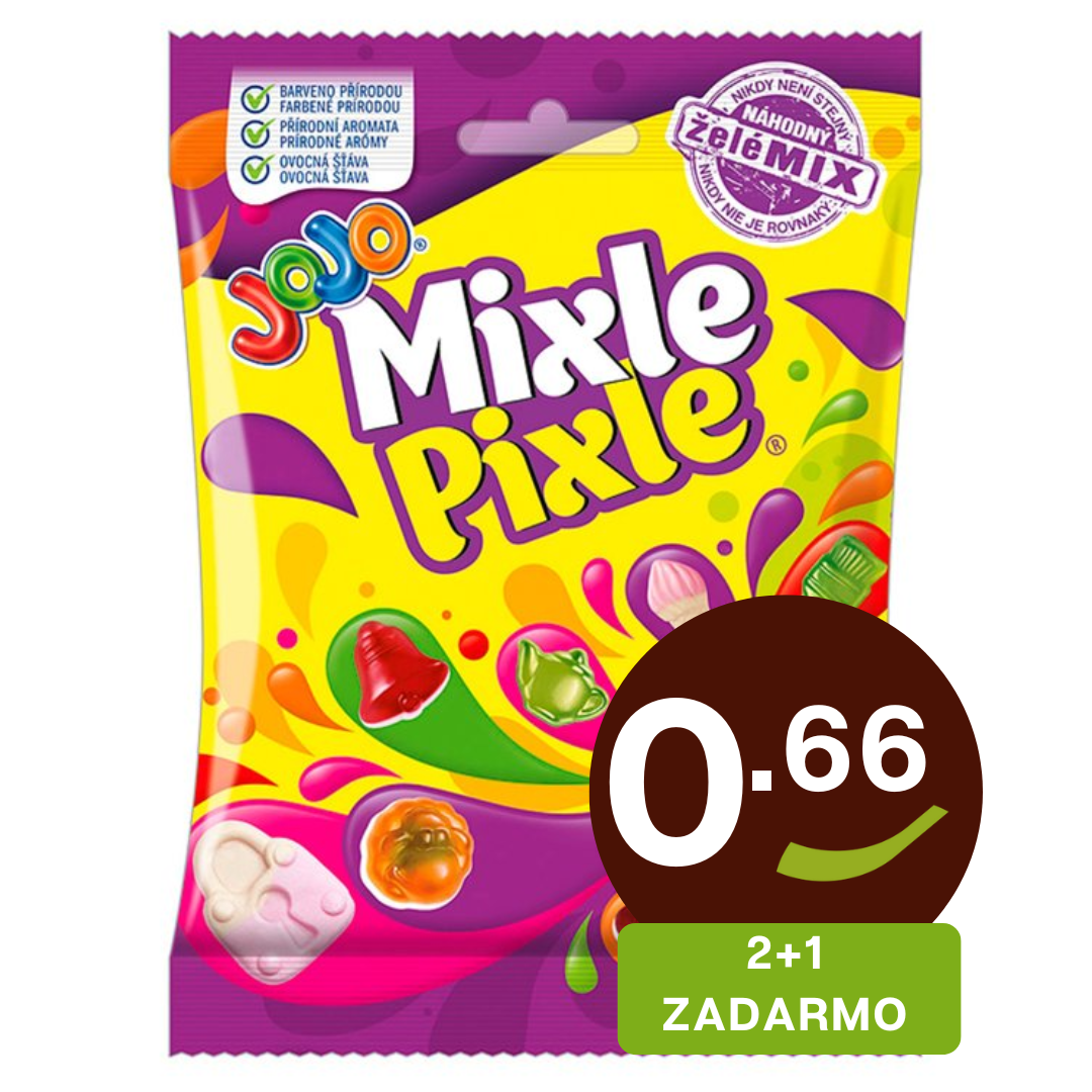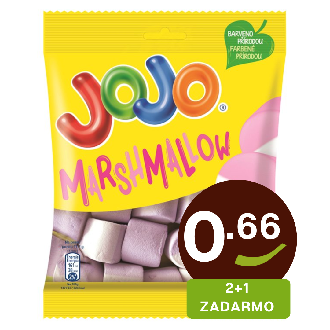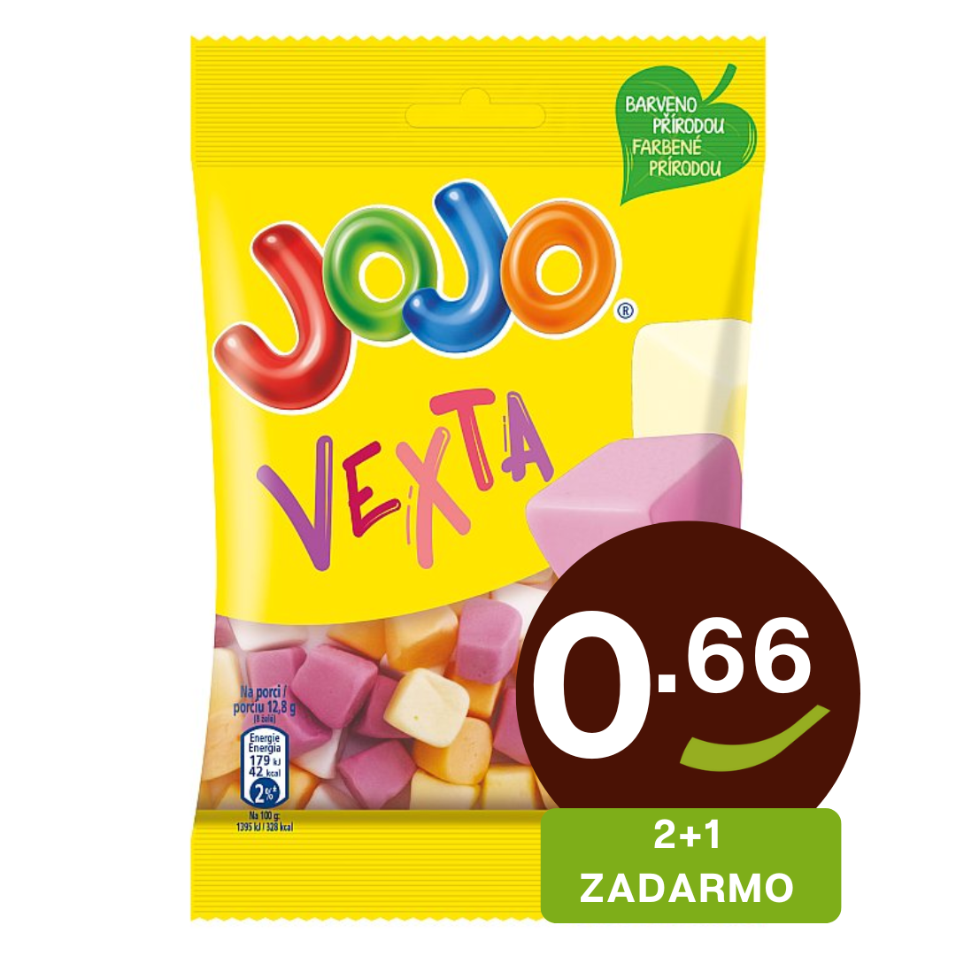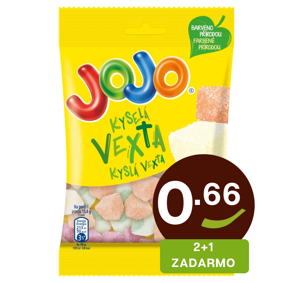 Cukor, glukózový sirup, pitná voda, želatína, kyselina (kyselina citrónová), arómy (jablko, višňa, pomaranč, citrón), palmový olej 0,1 %**, povlaková látka (karnaubský vosk), rastlinné koncentráty a extrakty (mrkva, požlt farbiarsky, ibištek), invertný cukrový sirup, farbivo (extrakt z papriky), ** Palmový olej je použitý z certifikovaných zdrojov. Viac informácií na: www.jojo.cz,