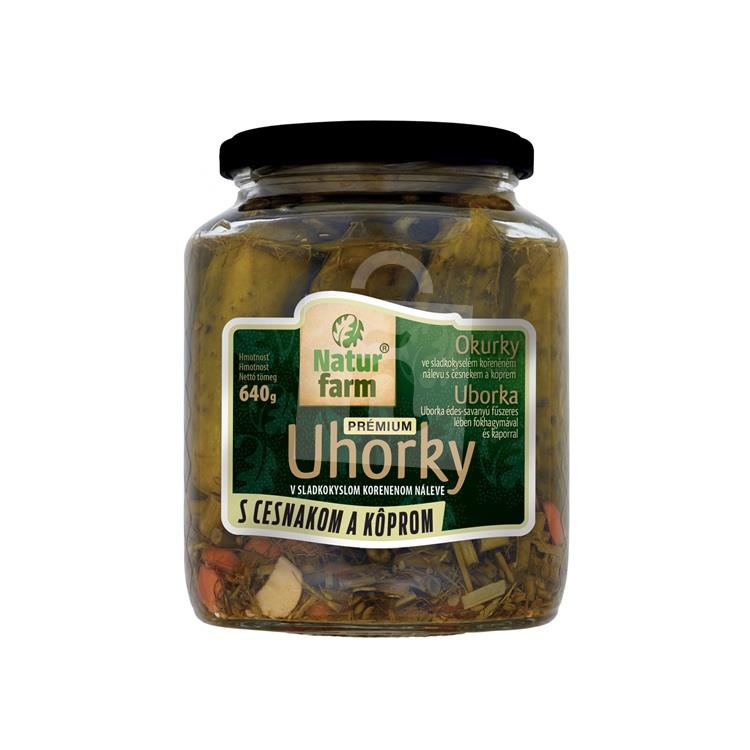 Uhorky sterilizované Prémium s cesnakom a kôprom v sladkokyslom korenenom náleve PP 300g / 640g Natur Farm