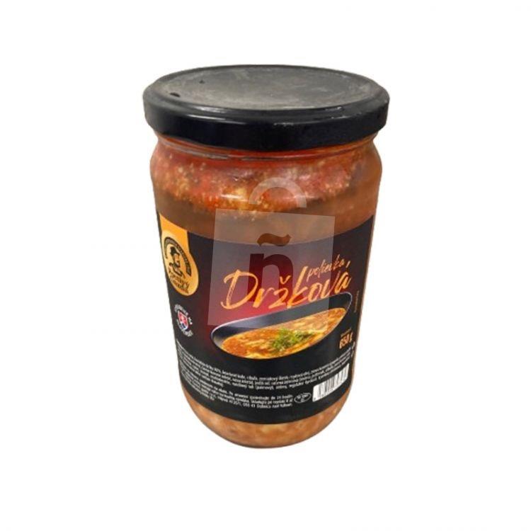 Pitná voda, hovädzie držky 30%, bravčové kože, cibuľa, zemiakový škrob, repkový olej, zmes korenín/paprika mletá sladká a pálivá, majoránka drvená, čierne korenie mleté, rasca mletá/, jedlá soľ, sušená zelenina /mrkva, paštrnák, cibuľa, petržlenová vňať, pažítka/,dextróza, cukor, cesnak, maltodextrín, rastlinný tuk /palmový/, arómy, regulátor kyslosti: kyselina citrónová, paprikový extrakt, konzervačná látka: sorban draselný