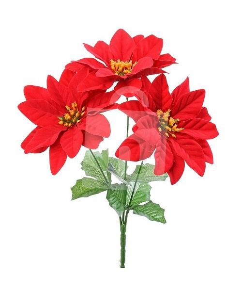 zapichovacia ozdoba, kvet poinsettia, kytica z troch kvetov, dĺžka 32 cm, červená.