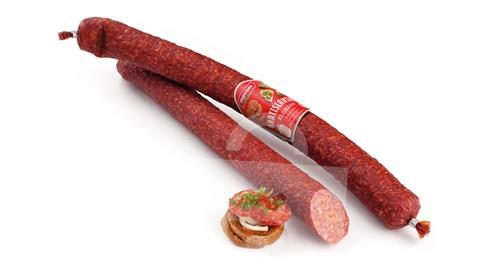 Bravčové mäso, bravčová slanina, hovädzie mäso, jedlá soľ, zmes prírodného korenia, dextróza, farbivo E162, antioxidant E300, E316, živočíšna bielkovina bravčová, extrakty korenín, aróma, farbivo E120, štartovacia kultúra, konzervačná látka E250. Na 100g hotového výrobku bolo použité 143g mäsa.